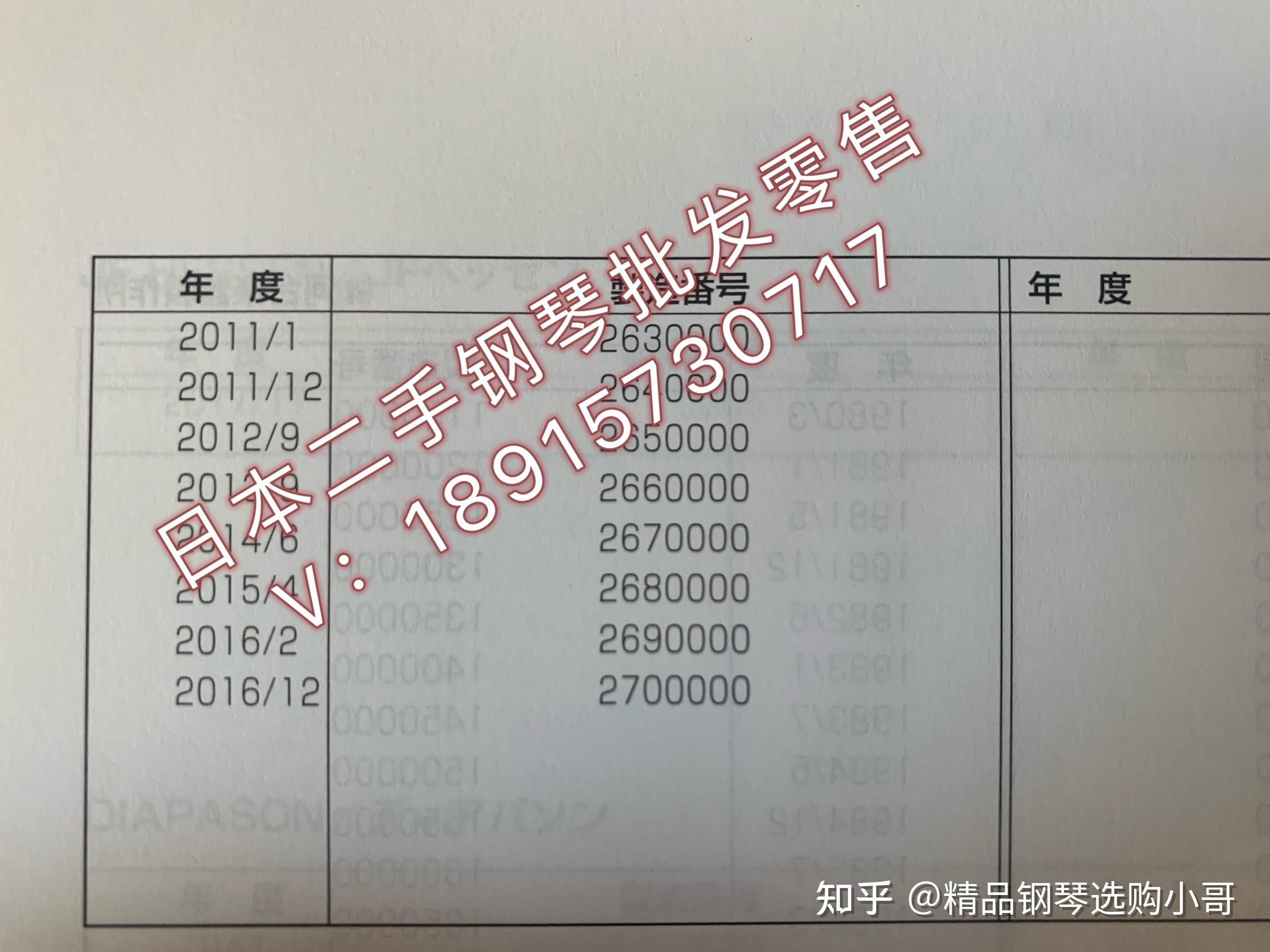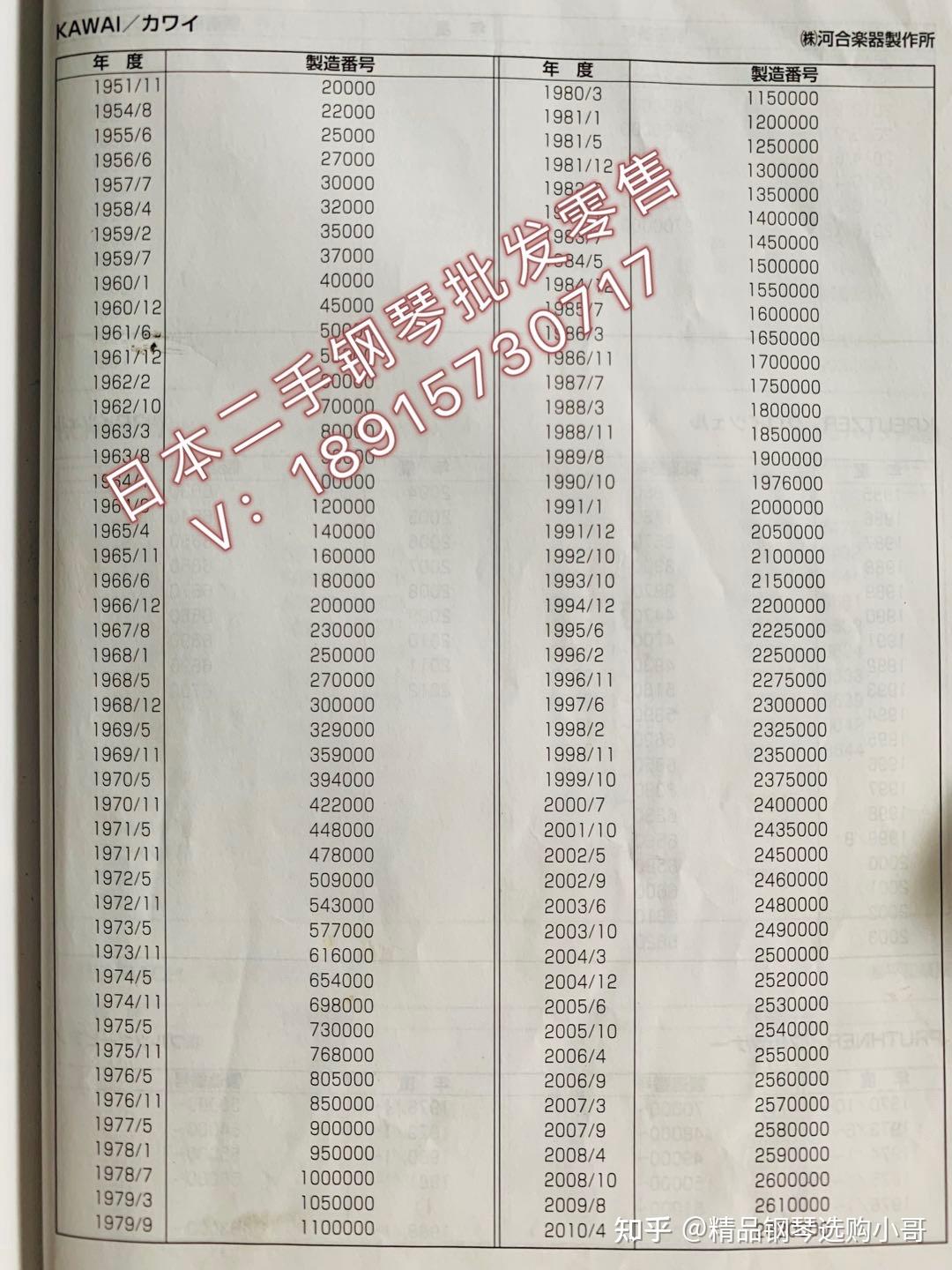 卡瓦依钢琴制造番号与年代对照表