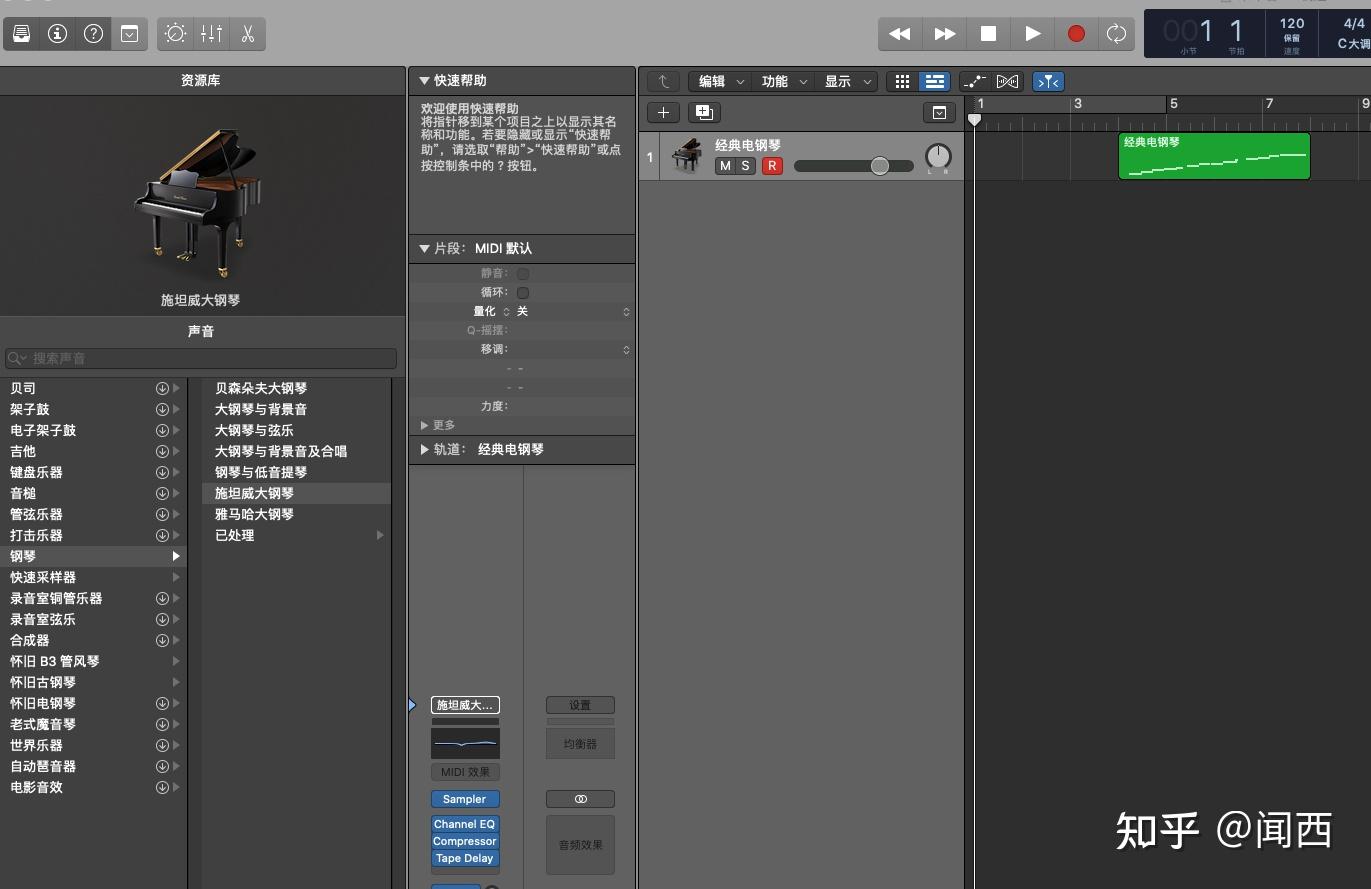 这种方式可以使用「软件乐器」的模式来录制MIDI,并加载音源,比如我加载的是「斯坦威大钢琴」:
