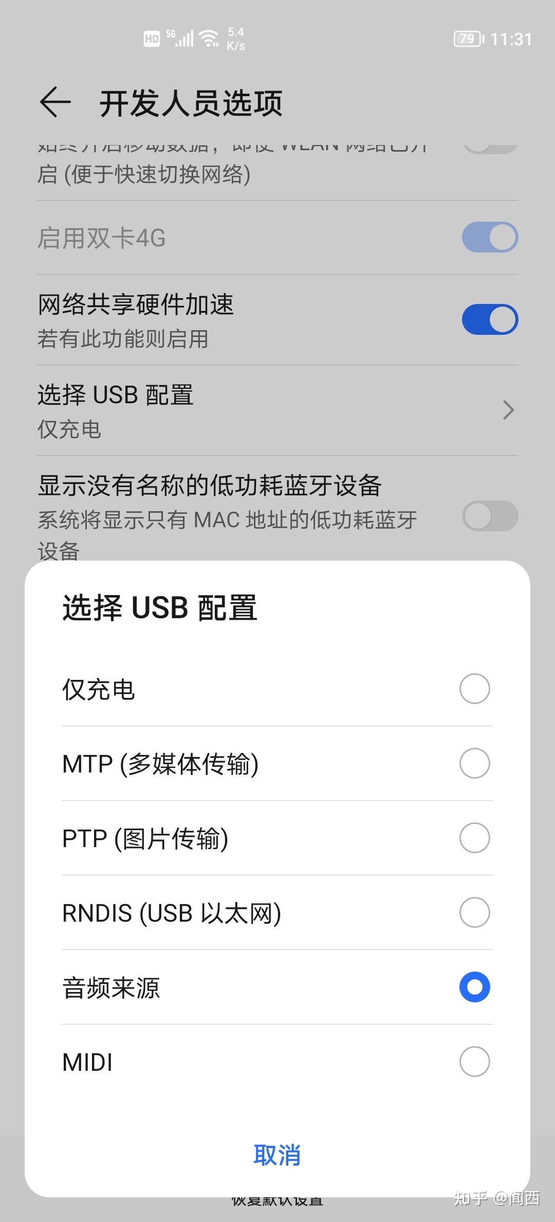 之后把这两根线连好,方口的那头插罗兰FP30背后的方孔,Type-C的这头接手机,然后进入手机系统「选择USB配置」,选择「音频来源」这个选项:
